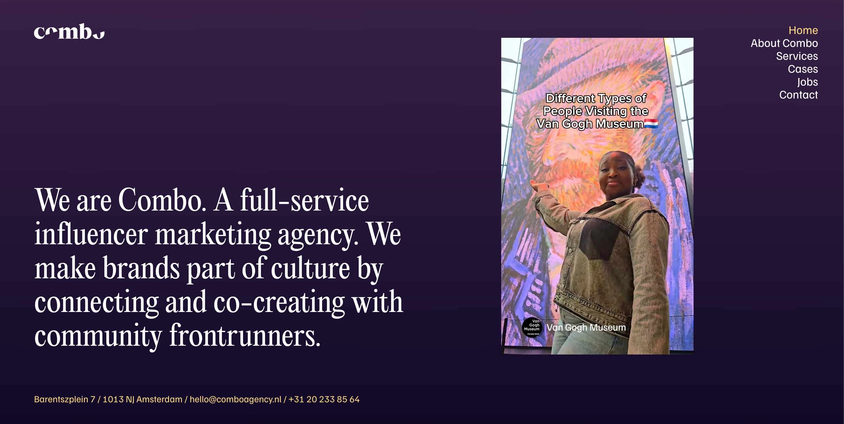 Known for: Combo is a specialist agency that prioritizes community-led marketing and cultural relevance over simple reach metrics. They are widely known for identifying and working with "community frontrunners", the individuals who actually shape subcultures. This approach ensures that brand collaborations feel authentic and organic rather than forced. Combo’s strength lies in its deep understanding of streetwear and youth culture, making them a favorite for brands looking to establish "cool" factor in the Dutch market.