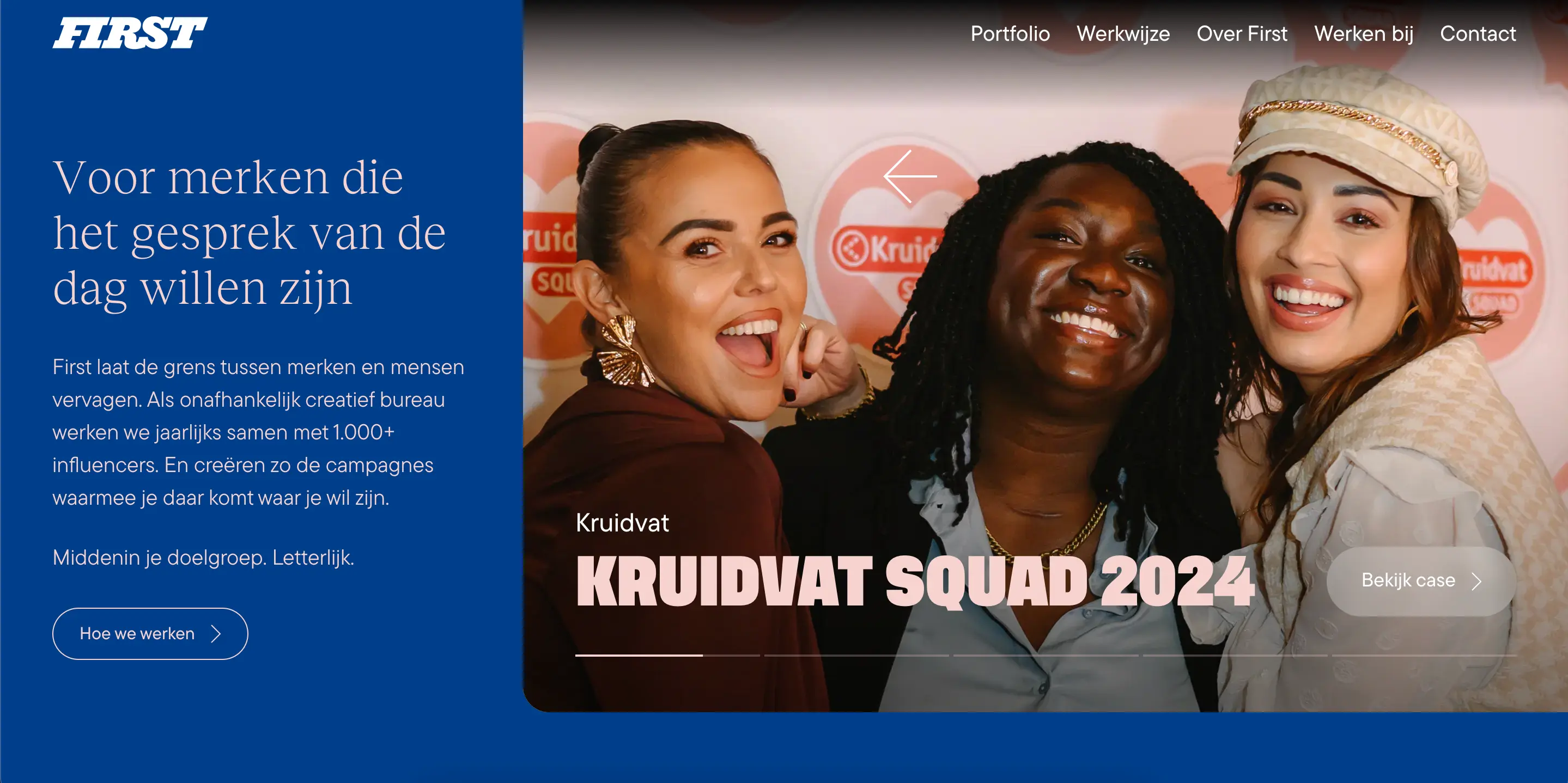 Known for: First is known as an independent creative agency that specializes in making brands "the talk of the day." They are recognized for their creative bravery and for pushing the boundaries of traditional influencer campaigns. First is known for managing the "Kruidvat Squad," one of the most successful and longest-running influencer programs in the Netherlands. They are highly skilled at blending creator content with mainstream pop culture.