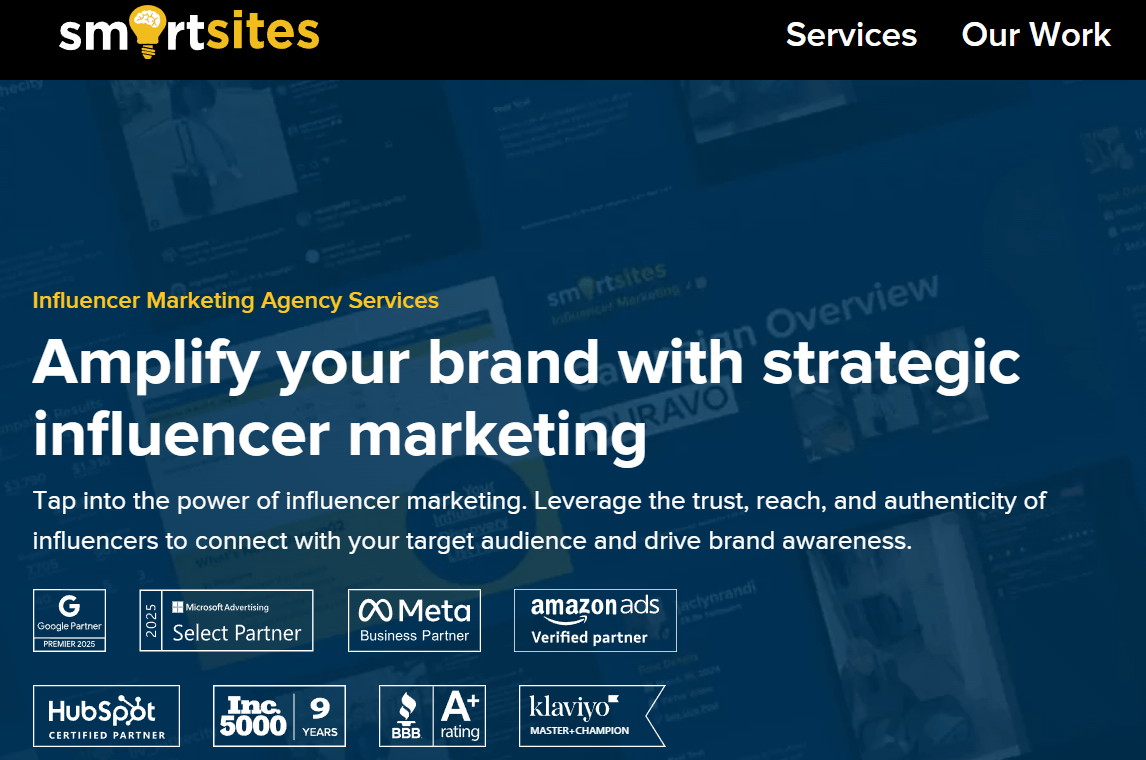 SmartSites is known for being a full-service, performance-driven digital marketing agency that combines web, paid media, SEO, email, social, and influencer marketing under one roof. SmartSites stands out for offering influencer marketing as part of a broader growth stack, which is useful for brands that want influencer to support acquisition and conversion—not operate in isolation.