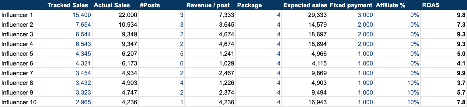 Revenue = #influencers X #posts X (Sales / Post) X AOV