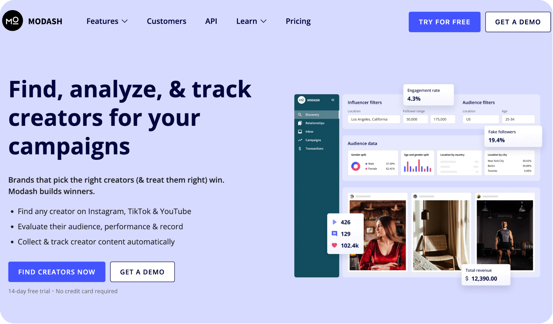 Modash is a newer influencer marketing platform known for its advanced search and filtering tools. It focuses solely on software without agency services and has quickly gained recognition for its efficient campaign management features.