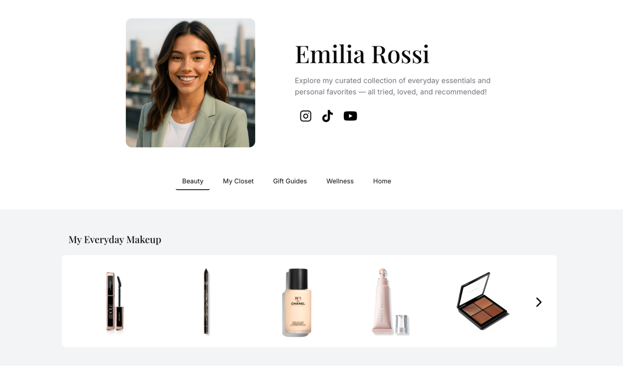A storefront functions like a curated shop where influencers showcase multiple products in one place. Instead of followers clicking through scattered links, they explore an organized collection — often styled and contextualized by the influencer.