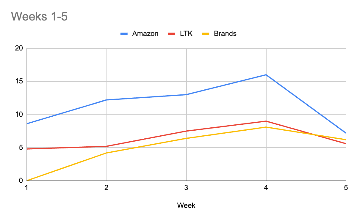 What we analyzed: During week 5, we continued tracking LTK and Amazon posts, as well as individual brand affiliate posts. Additionally, we noticed a significant number of influencers sharing links to their personal blogs through stories and reels.