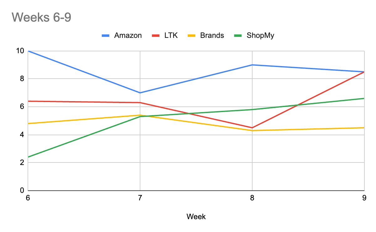 While the number of influencers sharing brand links was higher, the volume of posts per influencer was still greater for storefronts like Amazon, LTK, and ShopMy. Notably, in week 7, brand affiliate links surpassed Amazon Storefronts in total post volume, but this was an exception as weeks 8 and 9 showed Amazon with higher posting frequency again. Overall, storefronts remain the dominant focus in terms of total posts despite fewer influencers posting them.