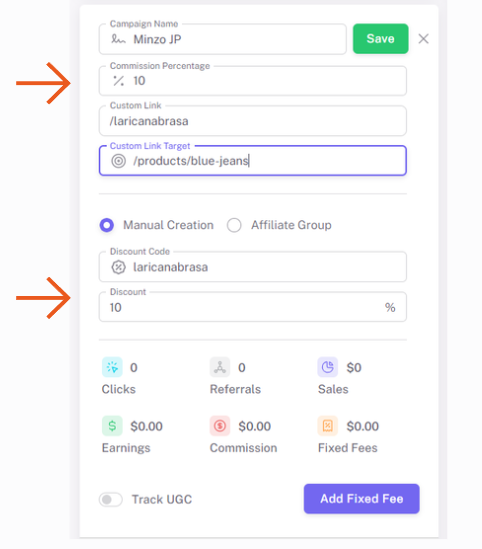 You first define the commission percentage the creator earns per sale. This percentage is automatically applied to any tracked revenue and added to the creator’s balance inside the CRM.