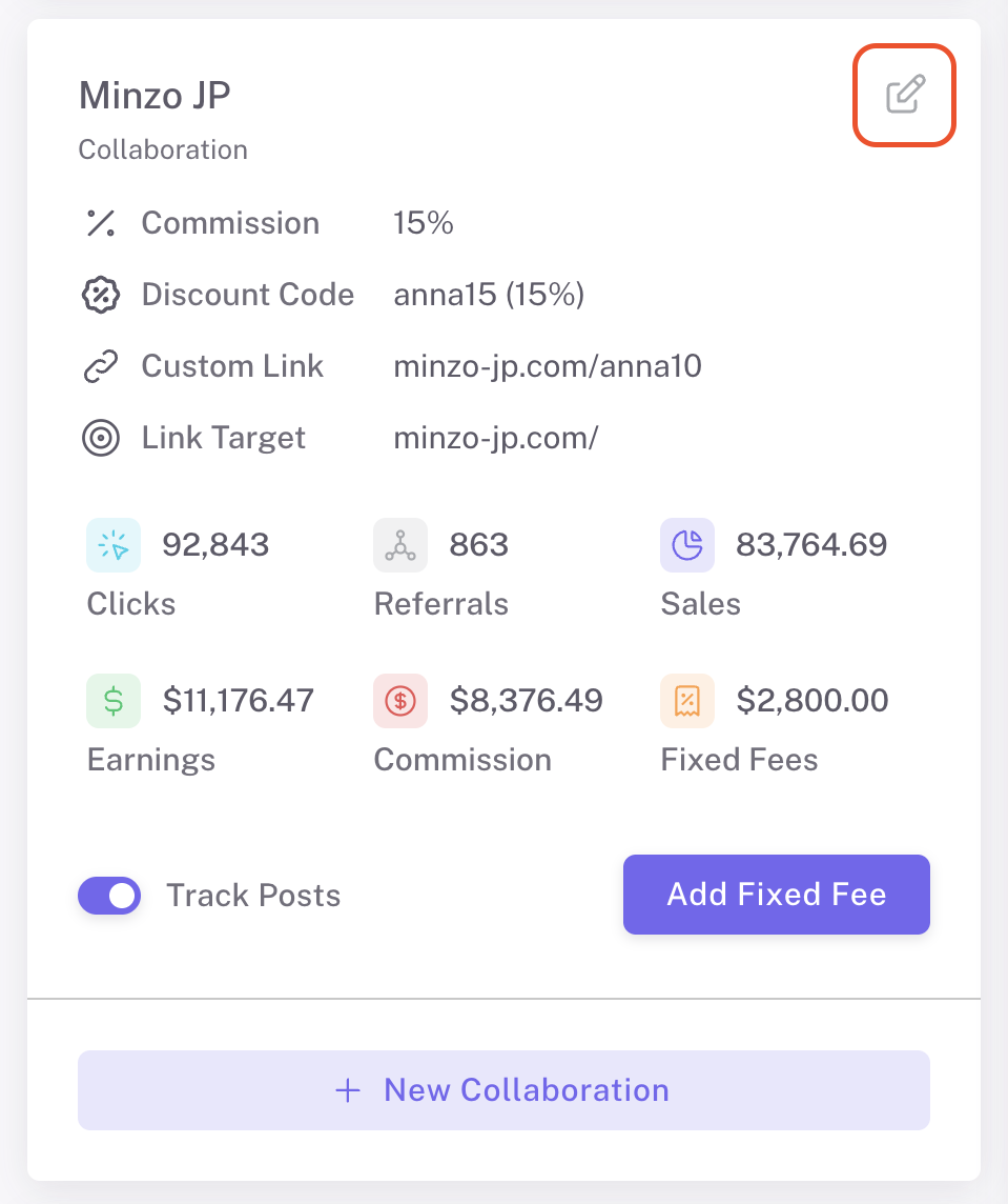 Commission rates can be adjusted per creator depending on the agreement. For example, you might assign 10% for testing collaborations and increase it to 15–20% for high-performing influencers.
