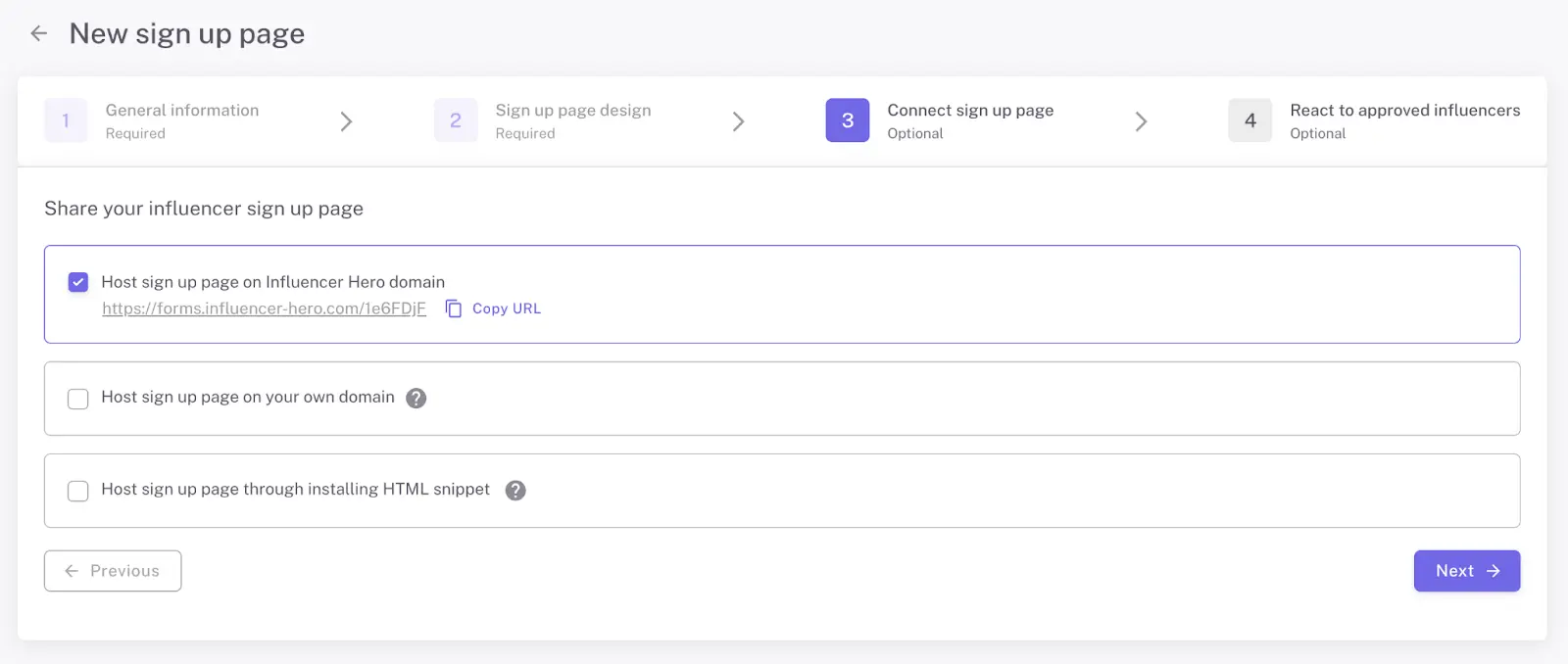 You have three flexible hosting options: you can host it on an Influencer Hero domain for the fastest setup, use a provided iFrame snippet to embed it directly into your own website (such as Shopify), or connect it to your own custom subdomain to appear as a native landing page on your site.