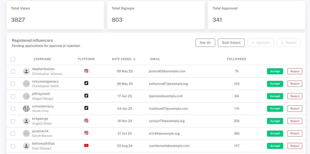 As applications roll in, they appear in a centralized "Registered Influencers" panel. This is your vetting station where you can verify social stats and review brand alignment in a single view.