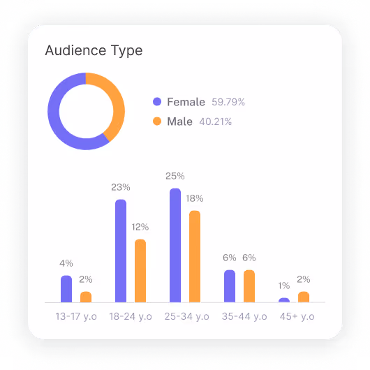 Analyze the exact gender split of an influencer's audience. In addition to gender distribution, you can also access age demographics, ensuring you reach precisely the people in your target audience.